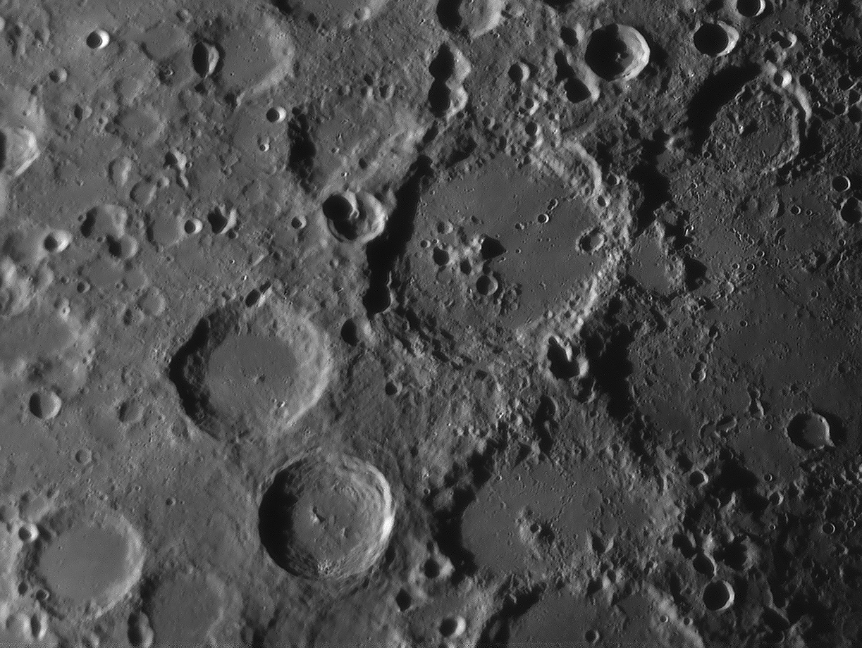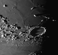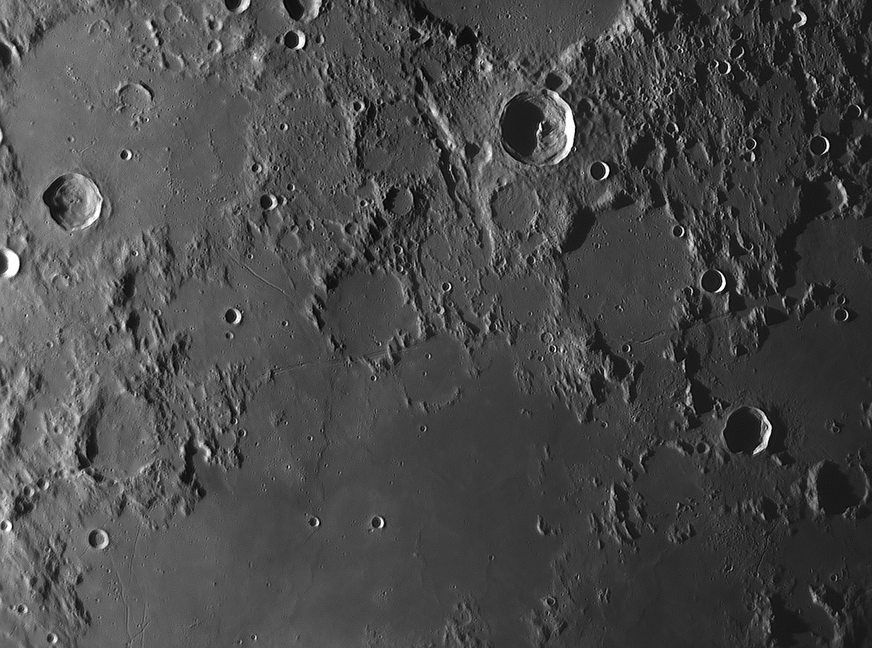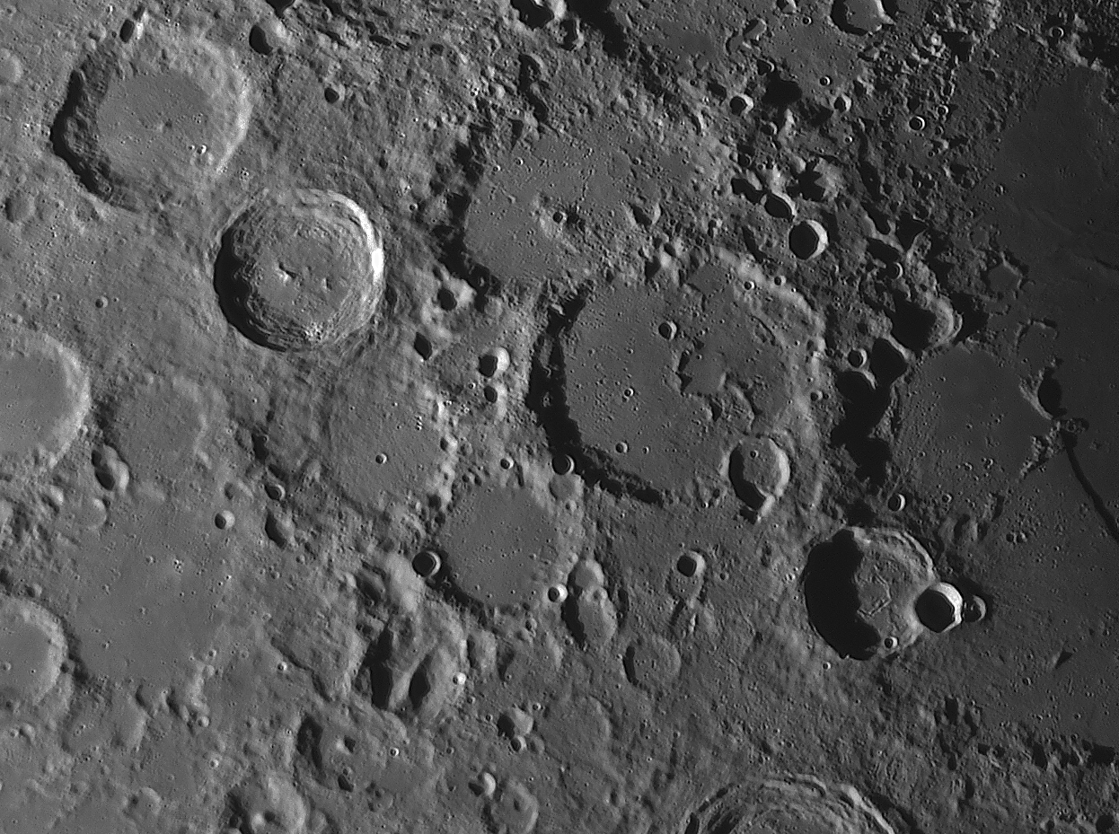 | Interesting image details Image 019 - shows the complex crater Stöffler. On the crater floor - like zebra stripes - ejecta from the Tycho impact Image 022 - shows the three big crater Ptolemaeus, Alphonsus and Albategnius NEW 2016 - Das Bild 0013 - shows the strange crater Delaunay. In the central part is elongated ridge that divides the crater. There are only two similar craters on the near side of the moon: Schiller and Heraclides. The Moon age was 8.8 days. NEW 2016 - Das Bild 0041 - The image 0041 shows a part of the so-called "Imbrium Sculpture" around the crater Ukert in Sinus Medii. Also in the image Hyginus and the Rima Hyginus at a Moon age of 8.8 days. Detailed descriptions of other exceptional or unique structures at this moon age you can find in this pdf-file |