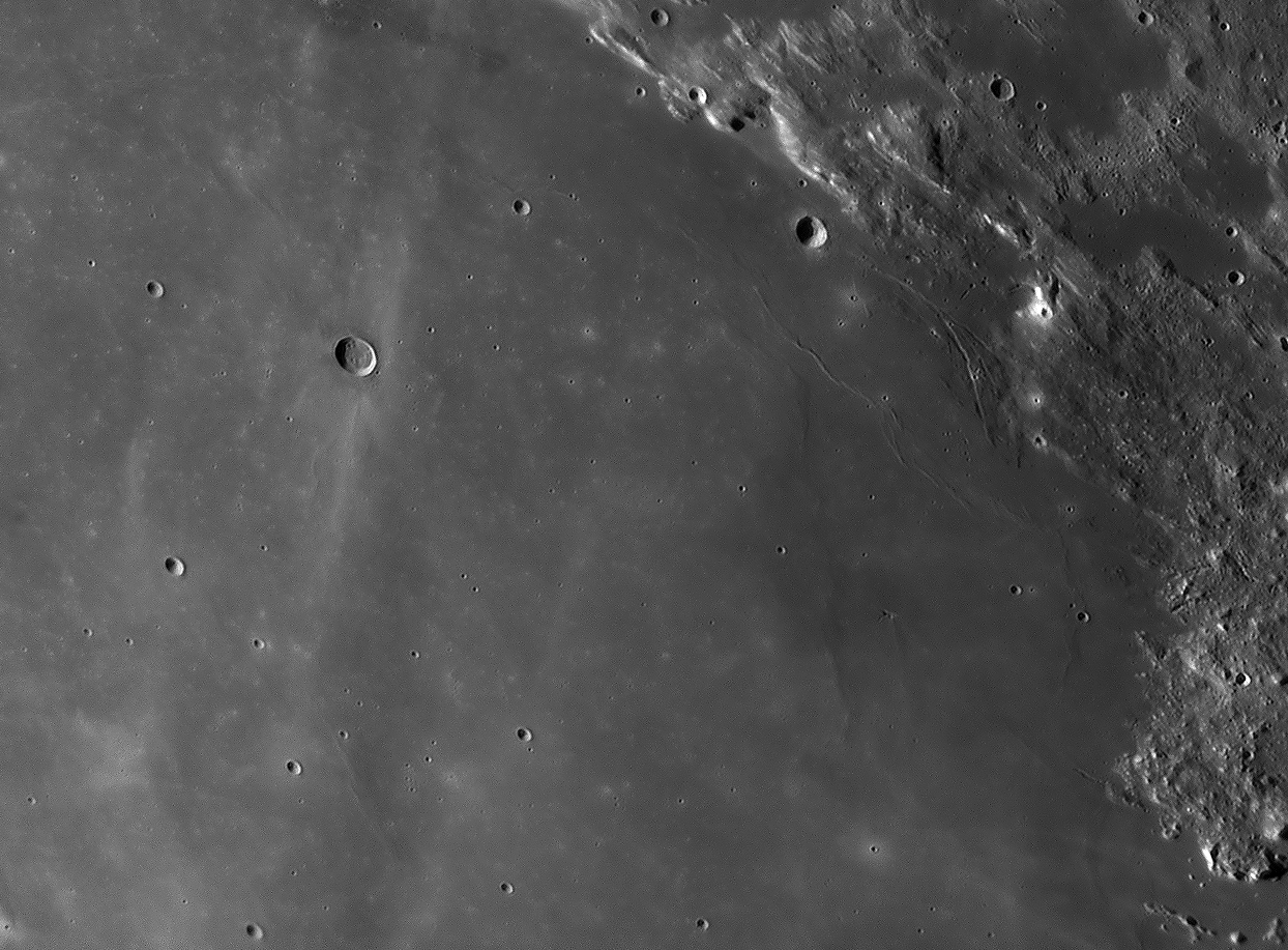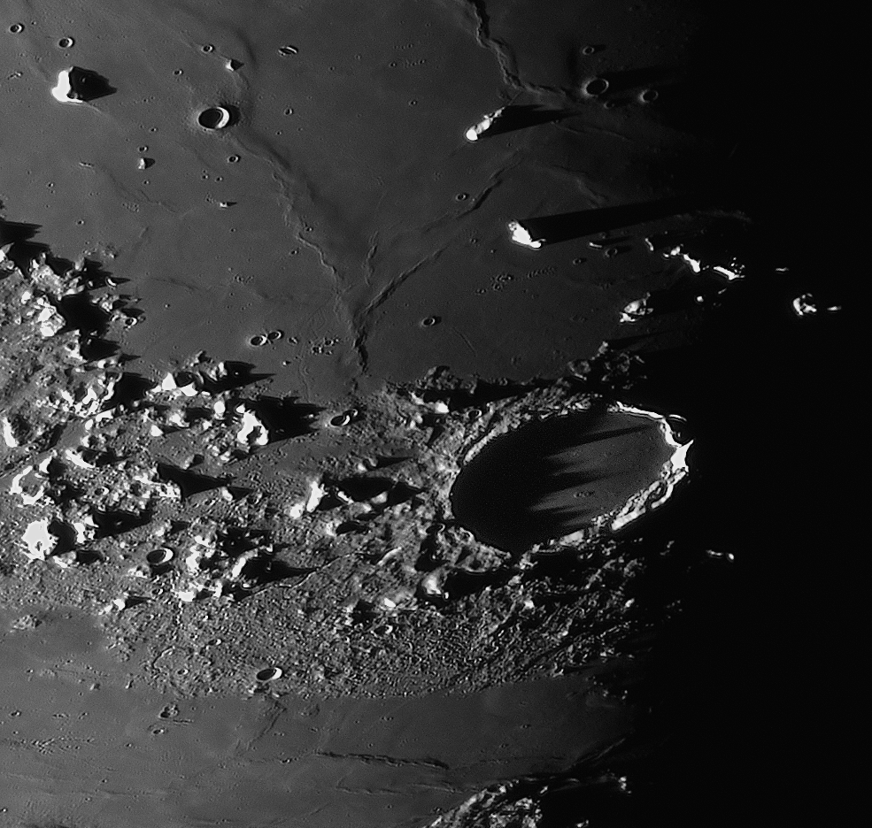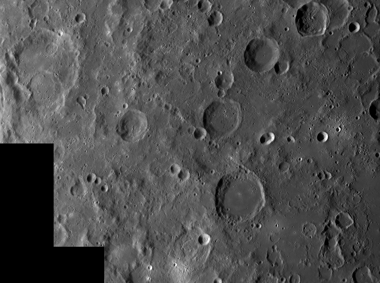| Interesting image details Image 019 - shows the complex crater Stöffler. On the crater floor - like zebra stripes - ejecta from the Tycho impact Image 022 - shows the three big crater Ptolemaeus, Alphonsus and Albategnius NEW 2016 - Das Bild 0013 - shows the strange crater Delaunay. In the central part is elongated ridge that divides the crater. There are only two similar craters on the near side of the moon: Schiller and Heraclides. The Moon age was 8.8 days. NEW 2016 - Das Bild 0041 - The image 0041 shows a part of the so-called "Imbrium Sculpture" around the crater Ukert in Sinus Medii. Also in the image Hyginus and the Rima Hyginus at a Moon age of 8.8 days. Detailed descriptions of other exceptional or unique structures at this moon age you can find in this pdf-file |