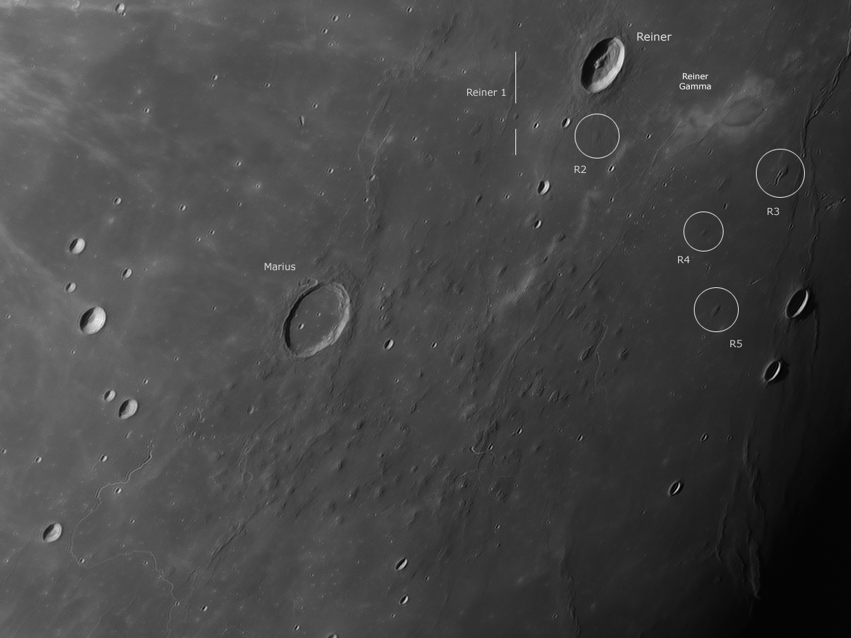 In the east and in the west of the crater Reiner (30 km) are 5 small