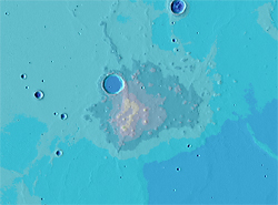 with a diameter of nearly 14 kilometers and a height of 170 meters. East of