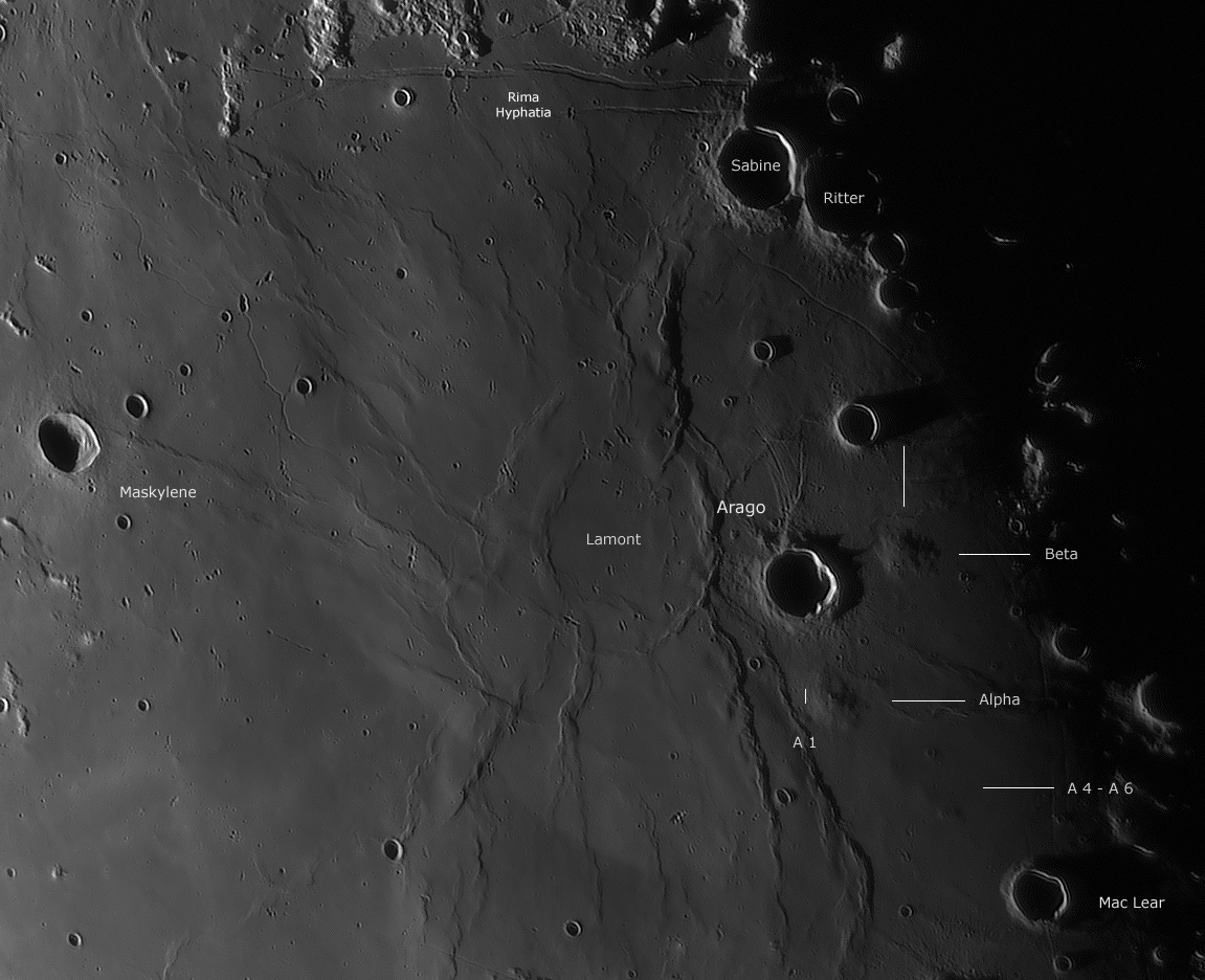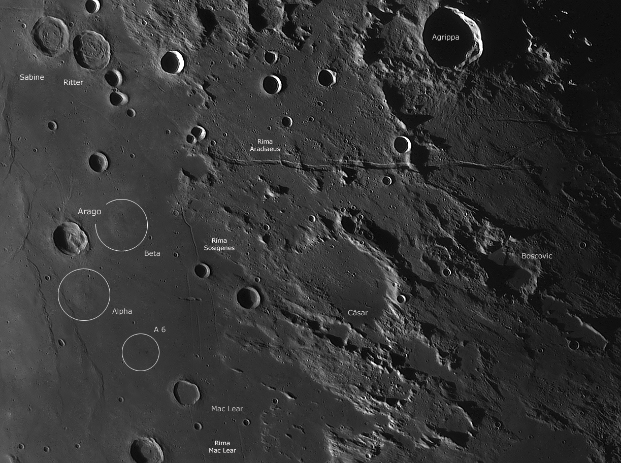 in the north and west of the crater Arago (26 km). Both are "show pieces" for