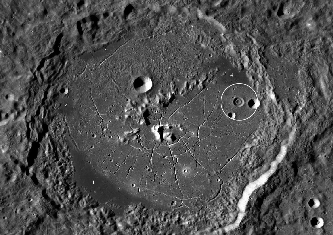 des inneren Kraterwalls liegen vier markannte dunkle Lavaflüsse