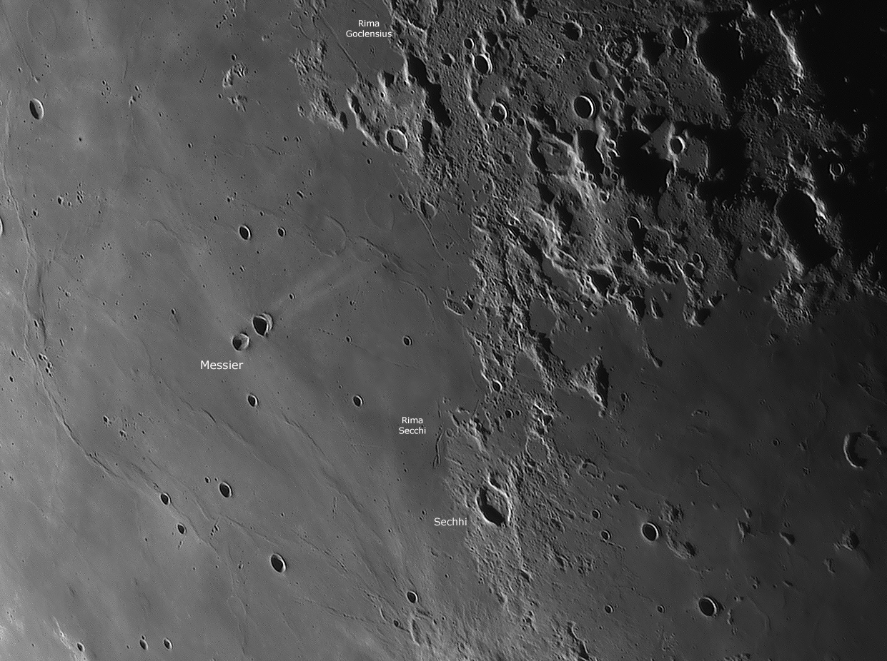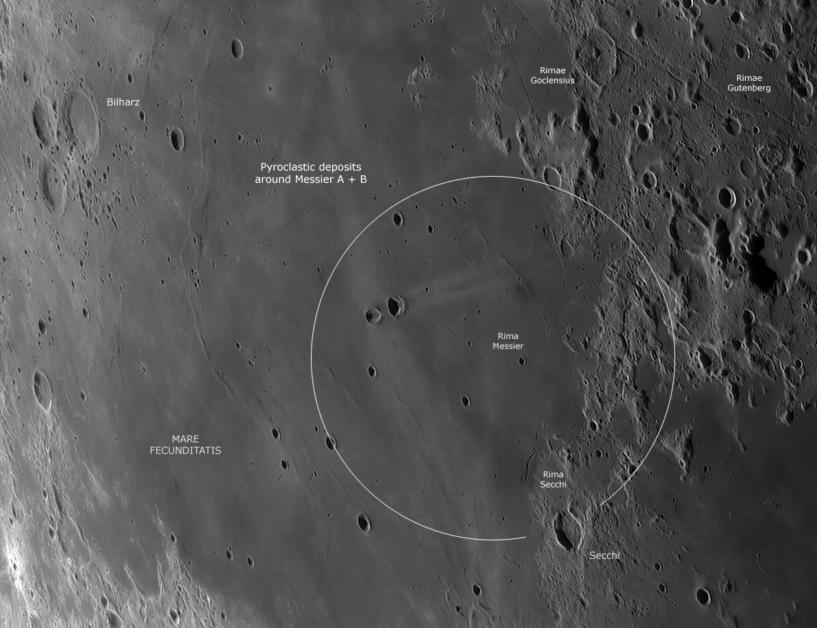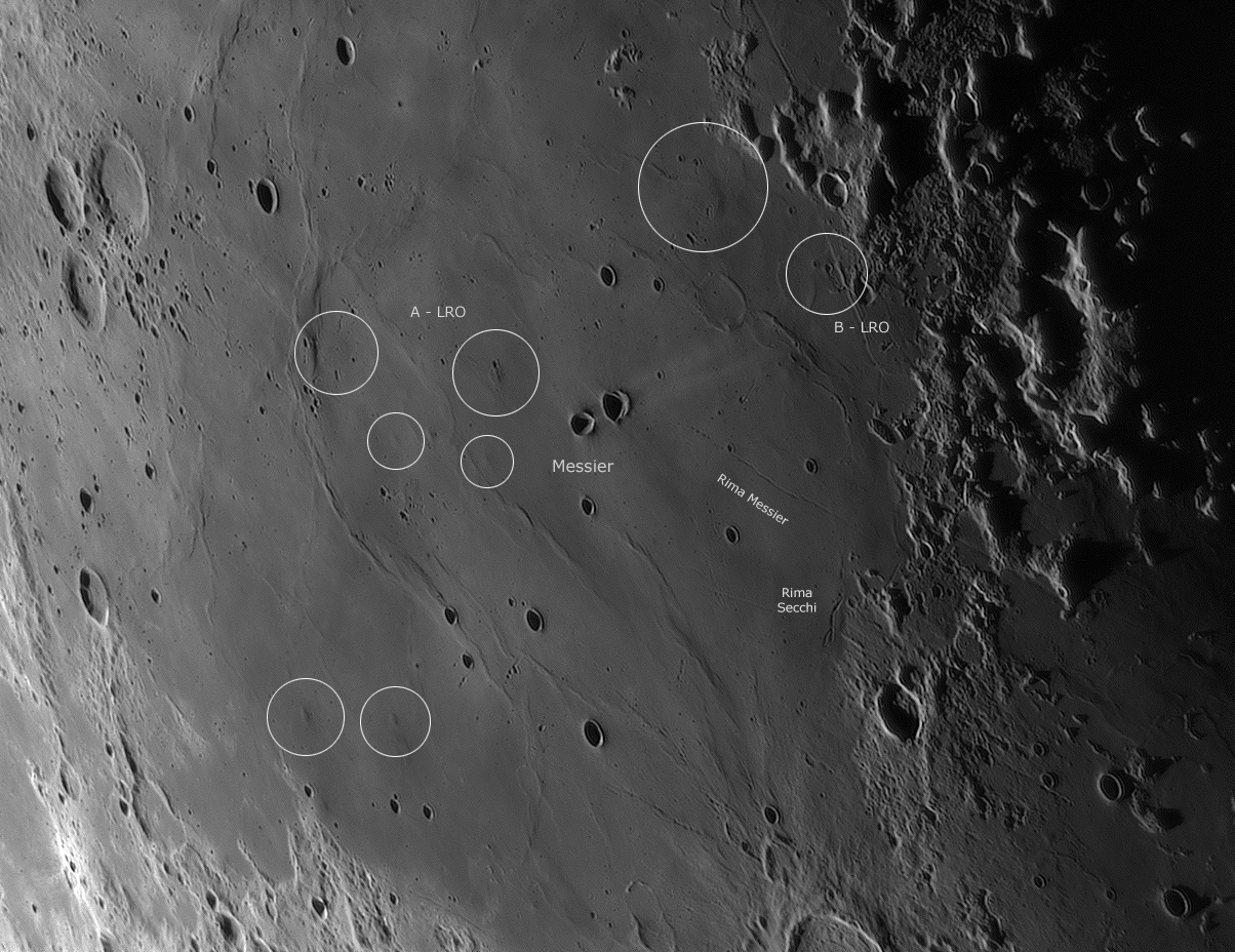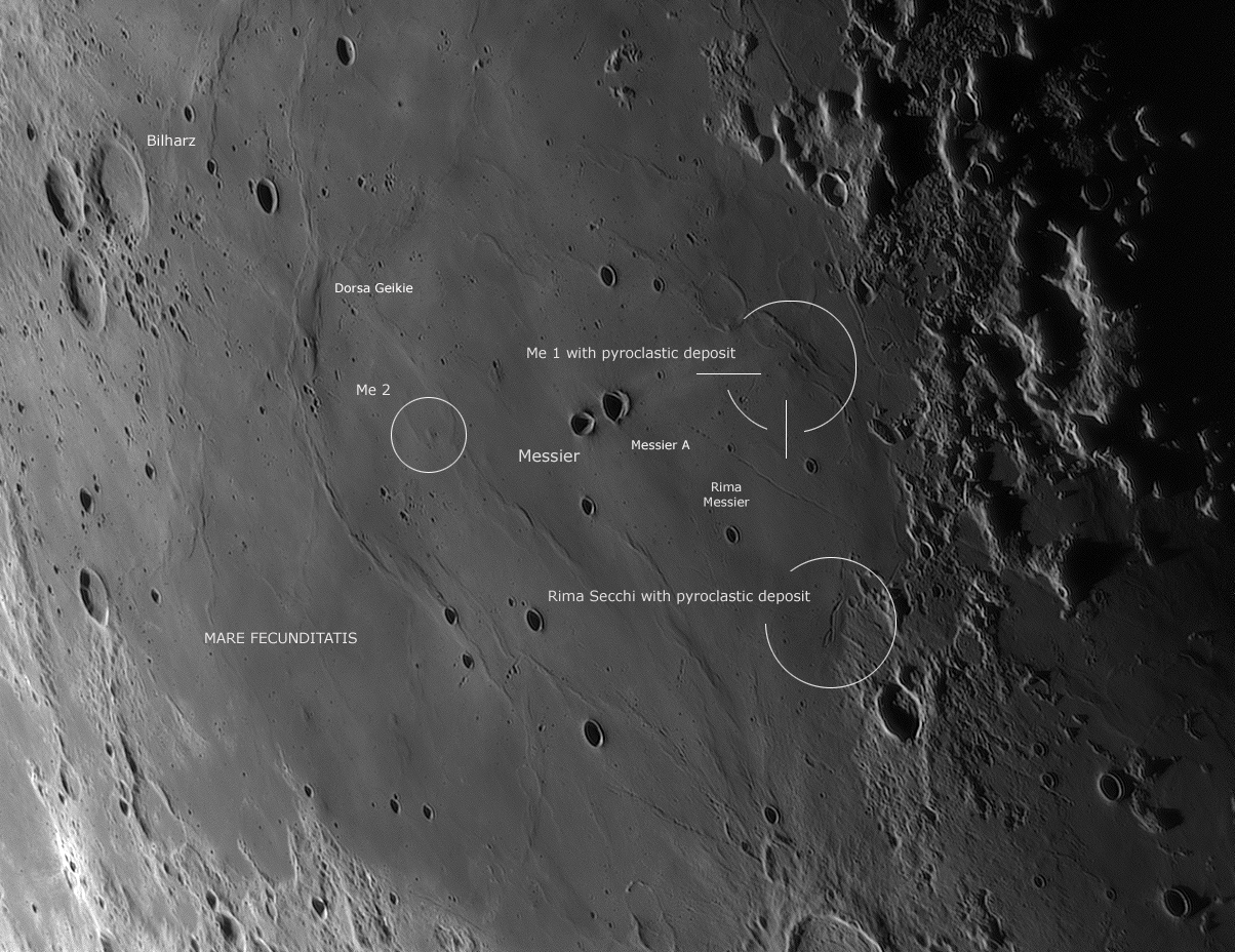 Krater Messier und Messier A liegen zwei kleine effusive Dome Me 1 und