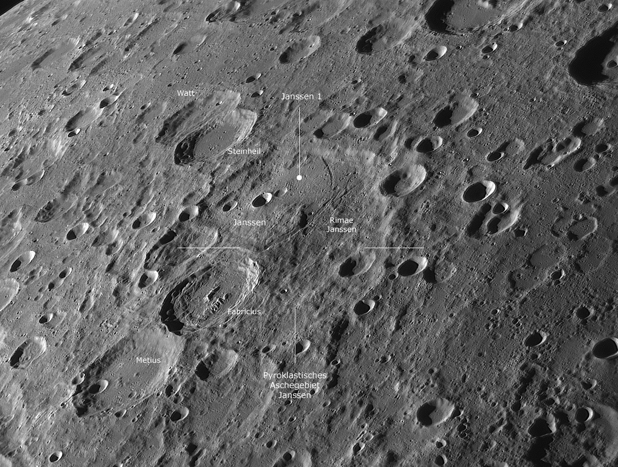 im Hochland ist das ausgeprägte Rillensystem, die Rimae Janssen. Um den