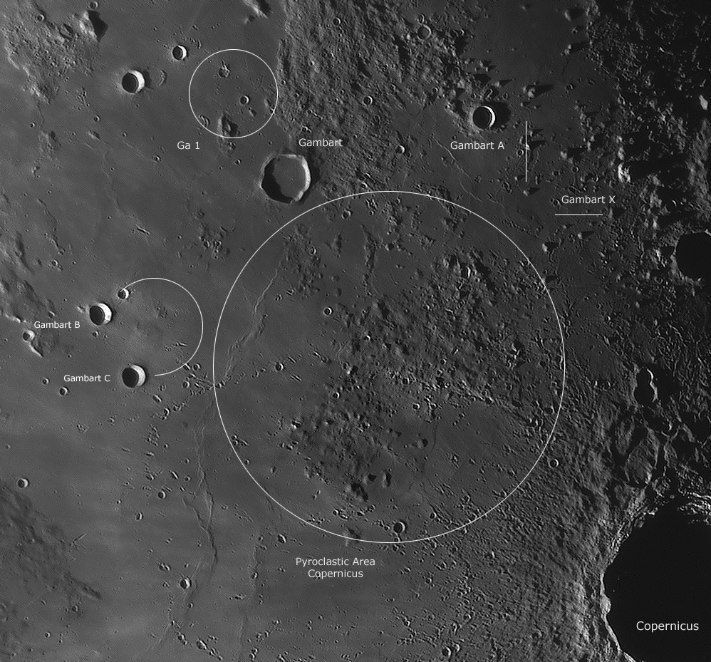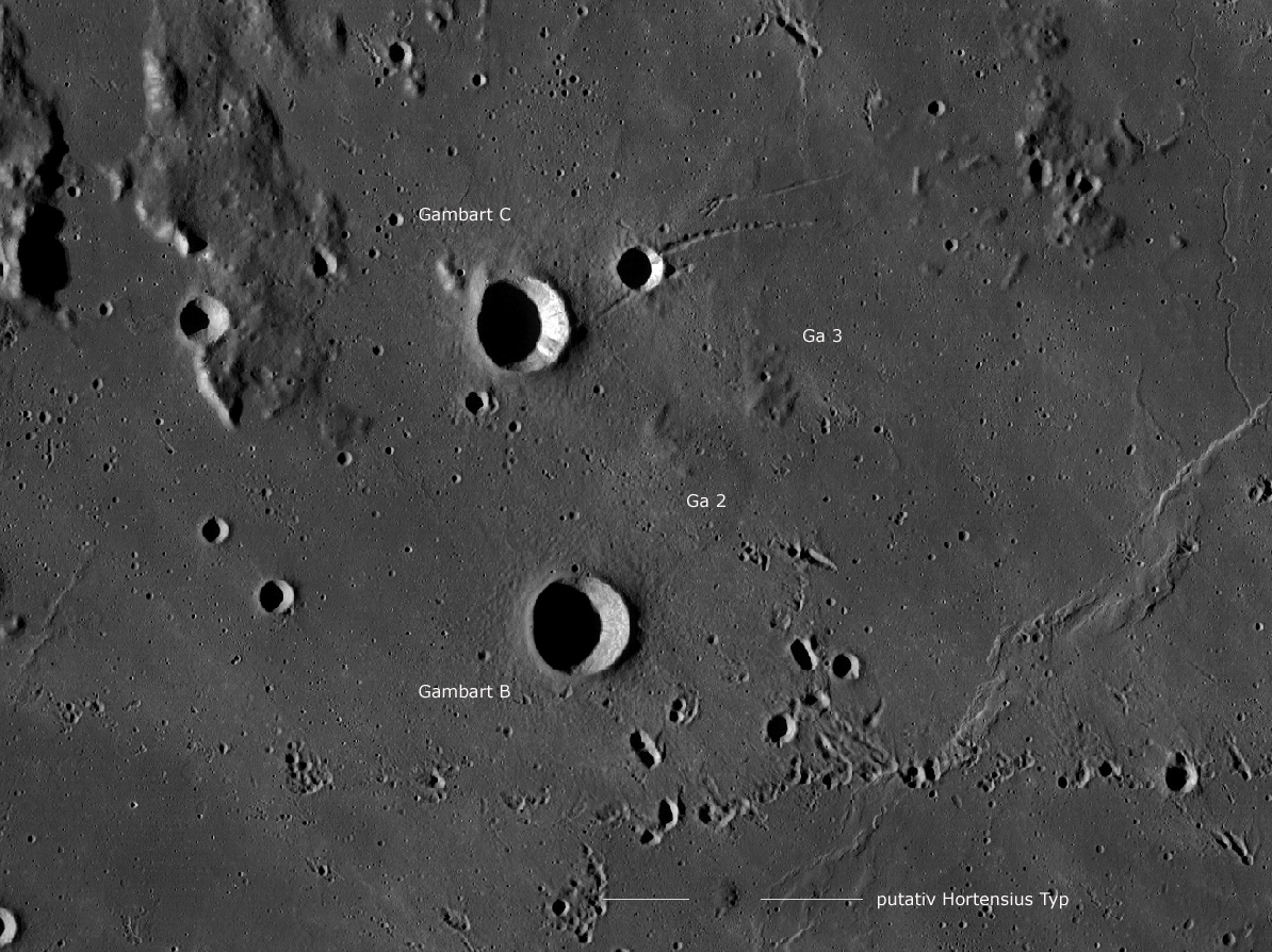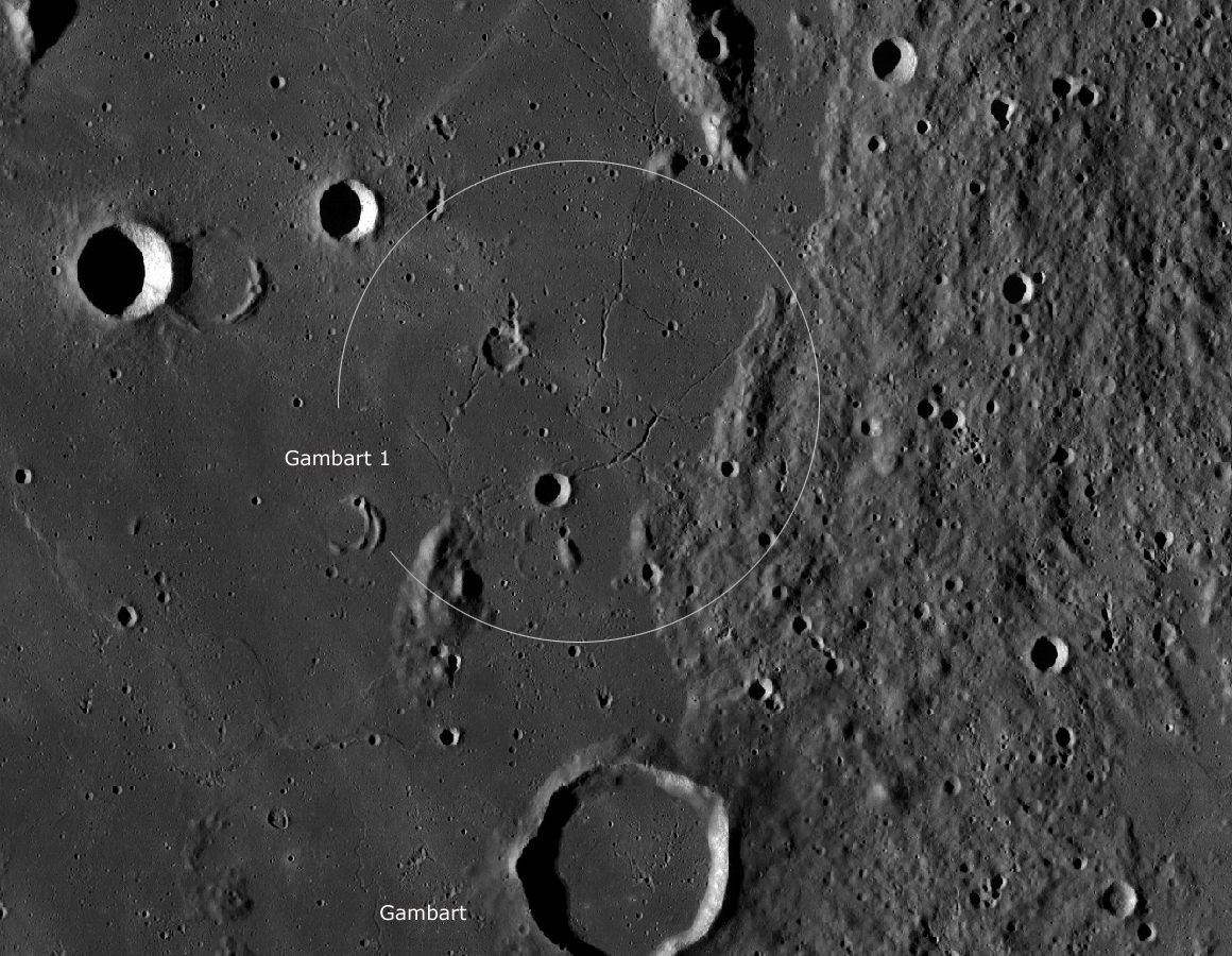 der kleinen Krater Gambart B und Gambart C (12 km) liegen zwei weitere Dome,