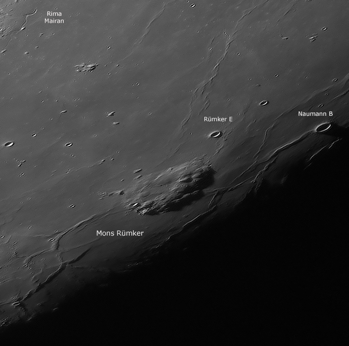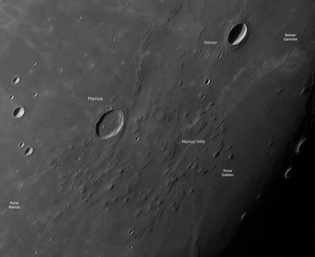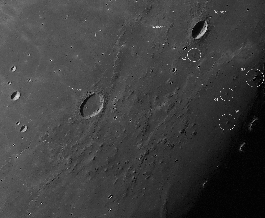 Westlich und östlich des Kraters Reiner (30 km) liegen 5 kleine